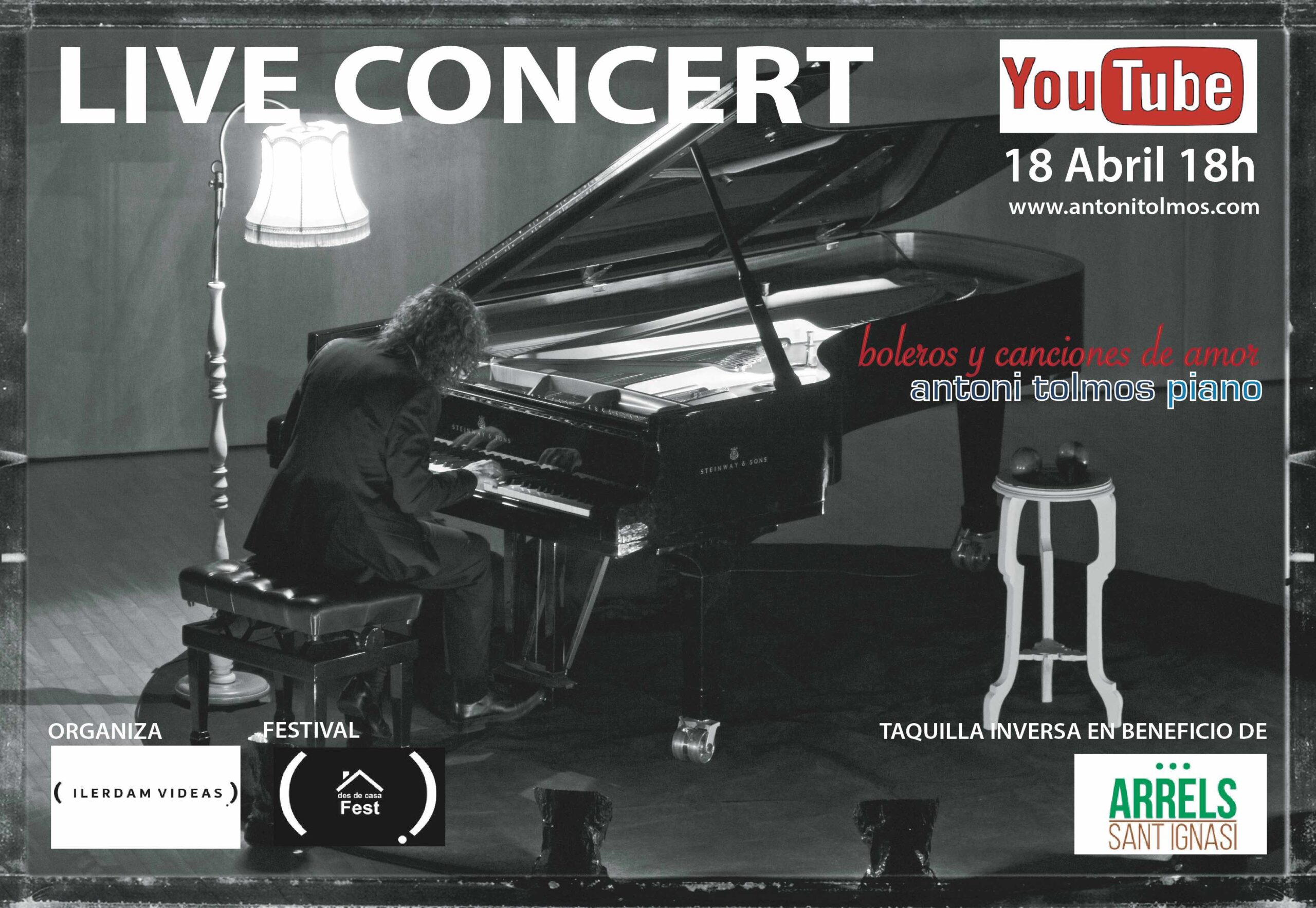 Este sábado 18 de abril a las 18h y en el marco del «Desde casa Fest» organizado por Ilerdam Videas, Antoni Tolmos ofrecerá un concierto en directo desde su estudio. La modalidad de Taquilla Inversa de este concierto irá íntegramente al n.º de cuenta bancaria de la Fundación Arrels Sant Ignasi que estos días está haciendo uno sobre esfuerzo para atender a las personas sin hogar y que tanto les gustaría poder también quedarse en su casa.